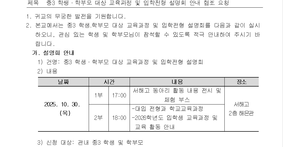 ¼­ÇذíµîÇб³_Áß3 Çлý¡¤Çкθð ´ë»ó ±³À°°úÁ¤ ¹× ÀÔÇÐÀüÇü ¼³¸íȸ ¾È³» °¡Á¤Åë½Å¹®(¿¹½Ã).hwp (319.00KB)