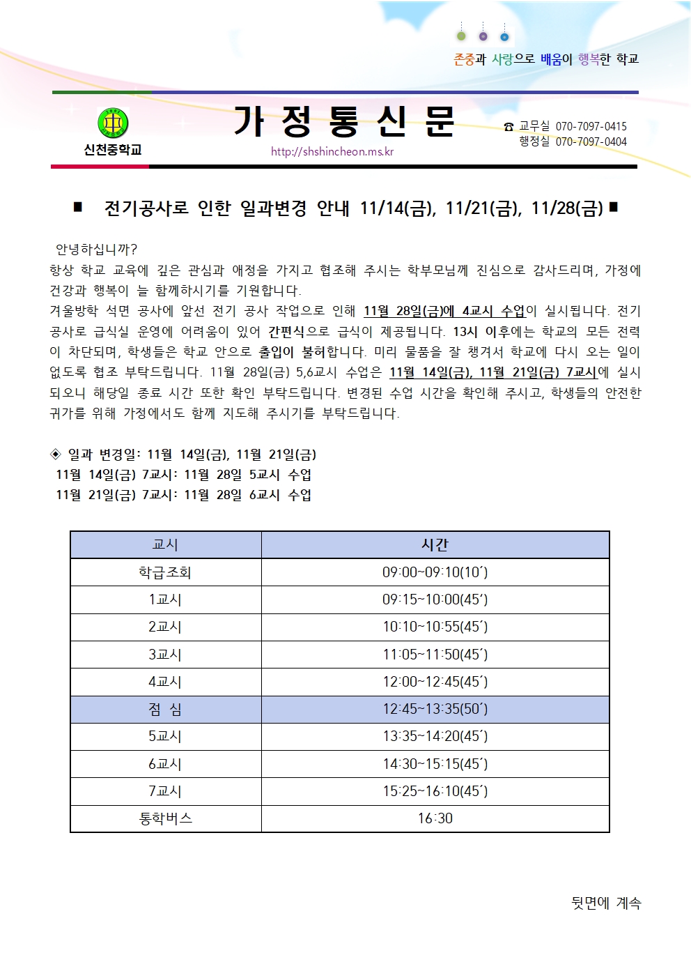 [ÀϹÝ] Àü±â°ø»ç·Î ÀÎÇÑ Àϰúº¯°æ ¾È³» 11/14(±Ý), 11/21(±Ý), 11/28(±Ý)